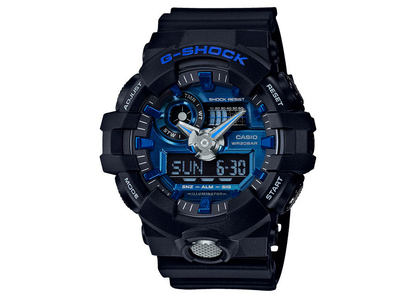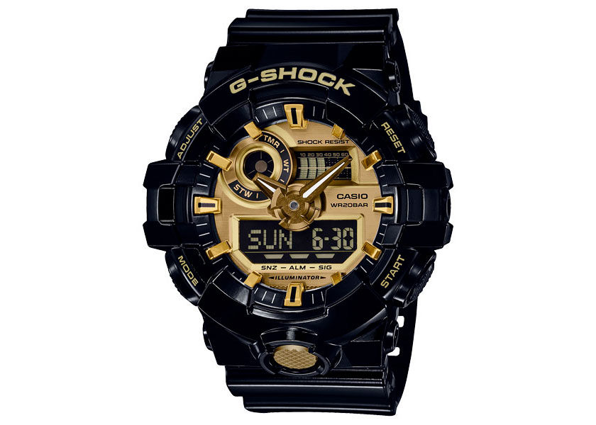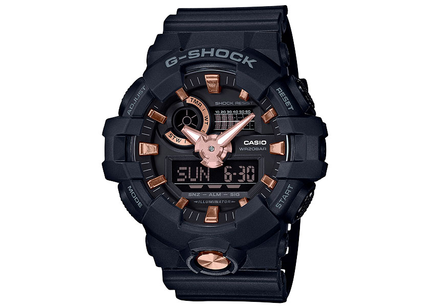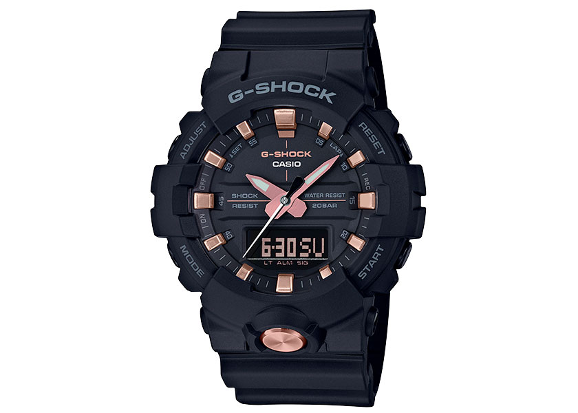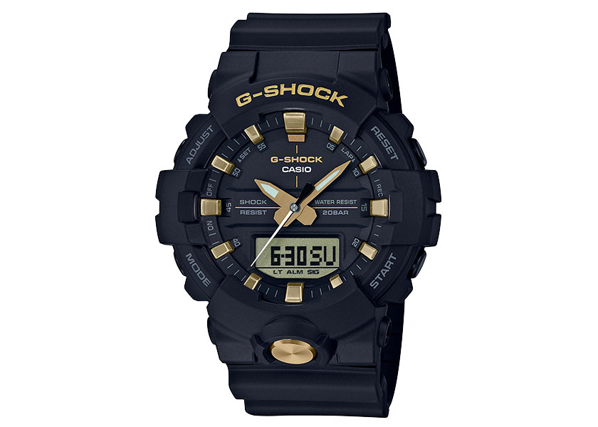 堅持不斷創新突破的G-SHOCK GA-710及GA-810系列,皆為指針數位雙顯設計,其中GA-810更加入獨立秒針設計,全系列錶款以品牌代表色黑色為主色調,而錶盤細節、指針、整點時刻及前方大型不繡鋼按鈕等處則以金屬設計點綴,創造出獨特且搶眼的效果。功能上維持G-SHOCK既有的耐衝擊構造、防水200米、LED照明…等設計概念,更搭載世界時間、計時碼錶、倒數計時…等多項功能。