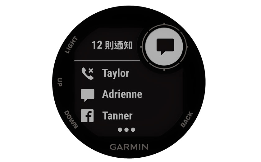 - 與相容手機保持連線,除智慧提示能讓訊息不漏接,也可自動上傳自身活動資訊至Garmin Connect的線上健康社群。