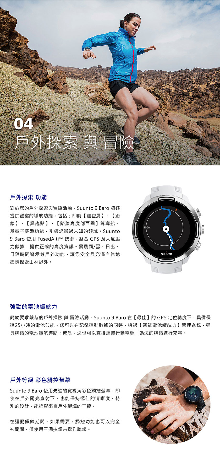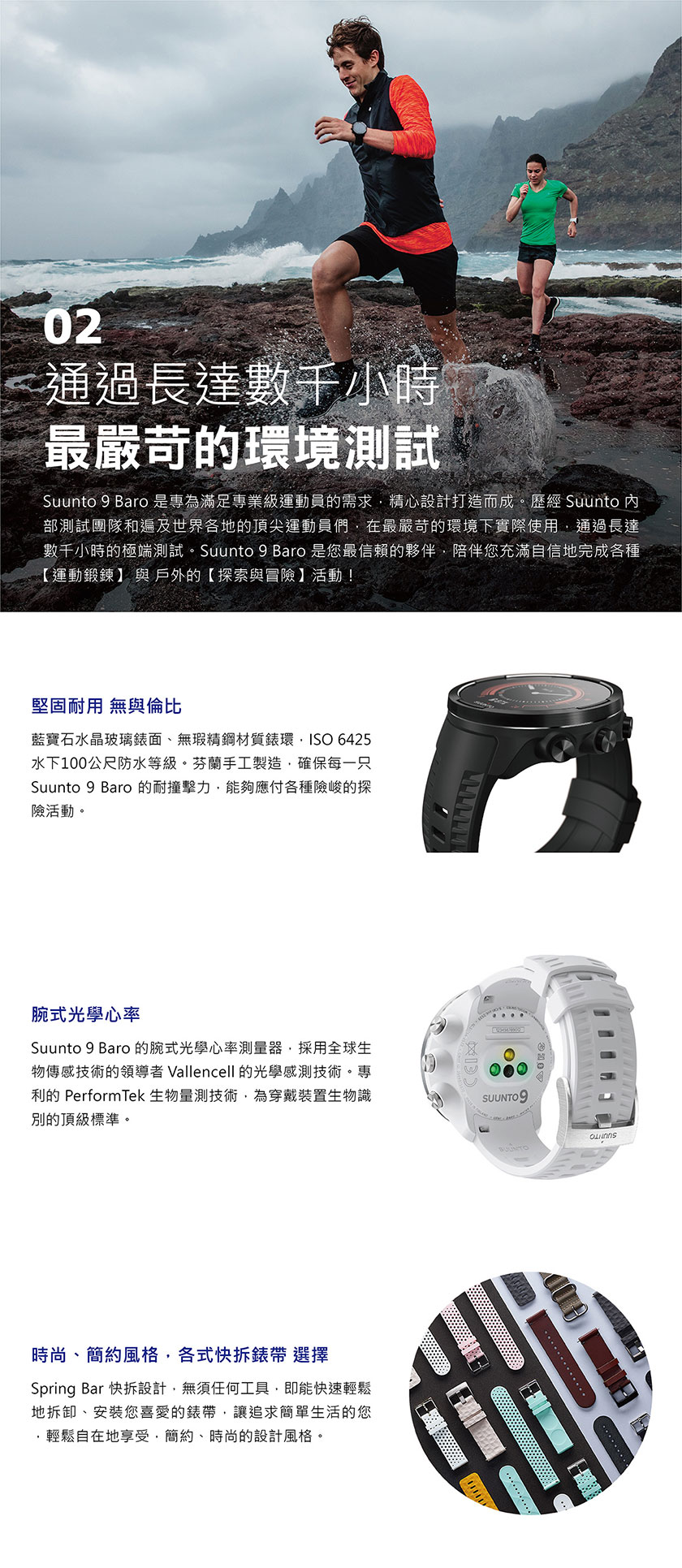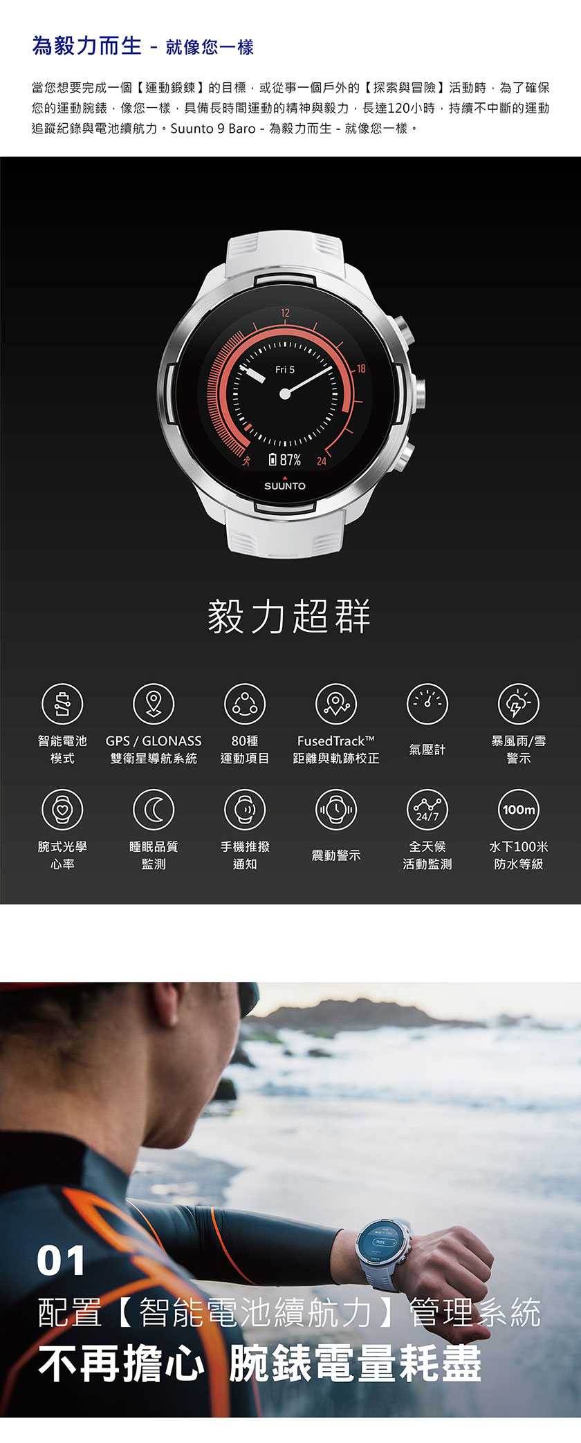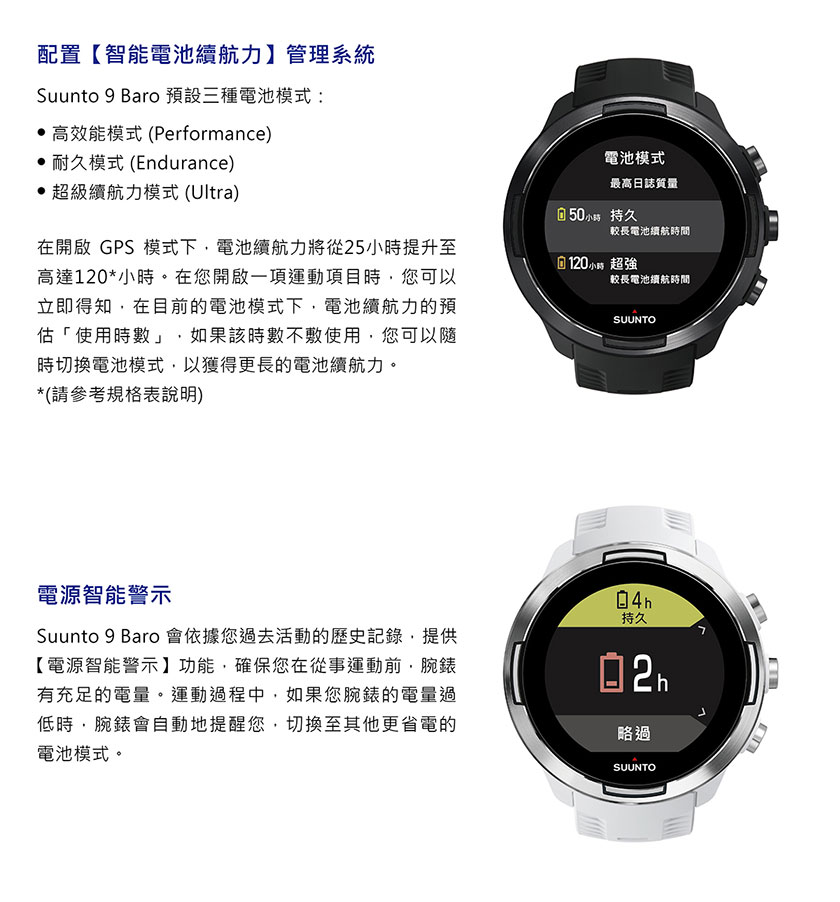 當您想要完成一個【運動鍛鍊】的目標,或從事一個戶外的探索與冒險活動時,為了確保您的運動腕錶,像您一樣,具備長時間運動的精神與毅力,長達120小時,持續不中斷的運動追蹤紀錄與電池續航力。SUUNTO 9 BARO-為毅力而生-就像您一樣。SUUNTO 9 BARO 是一款多項目運動的全方位GPS運動腕錶,專為要求最嚴苛的運動員所設計製造。配置【智能電池續航力】管理系統,提供智能警示功能,確保電池續航力,滿足您所有運動鍛鍊及戶外冒險的需求。SUUNTO 9-堅固強勁,是您長時間的艱苦訓練、賽事與極限冒險的最佳夥伴。