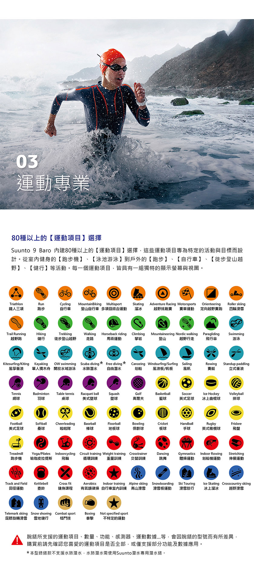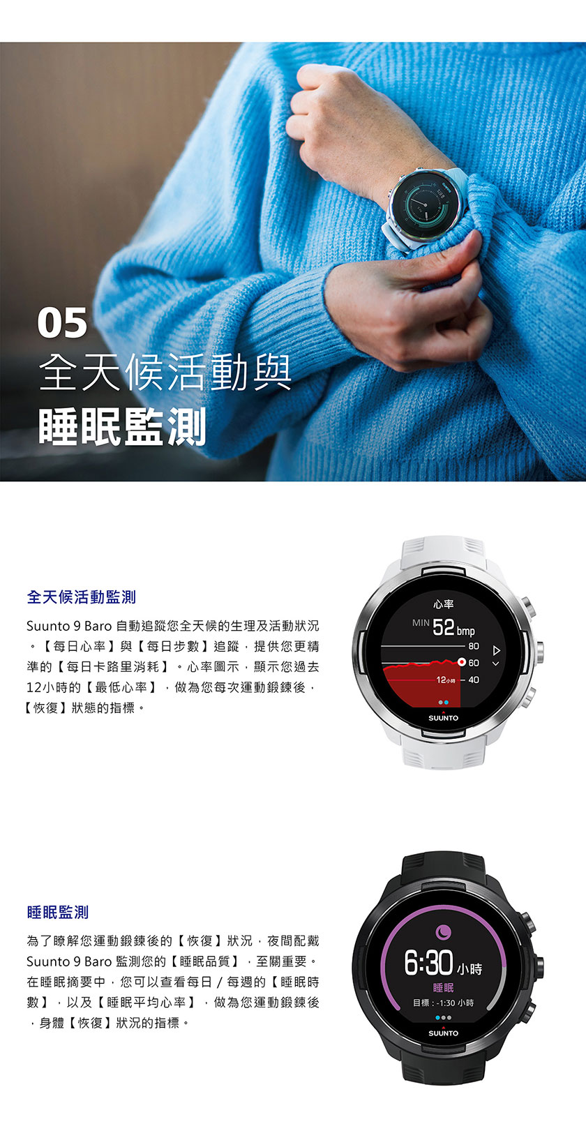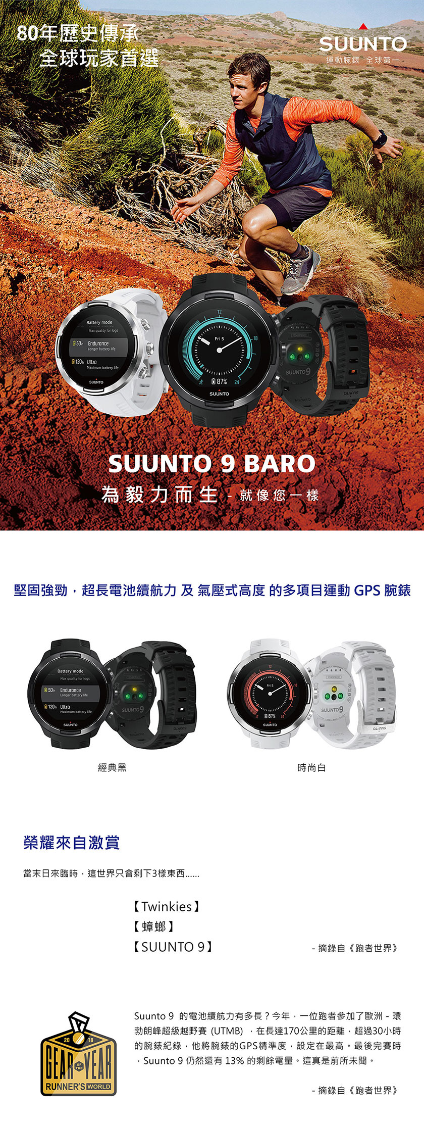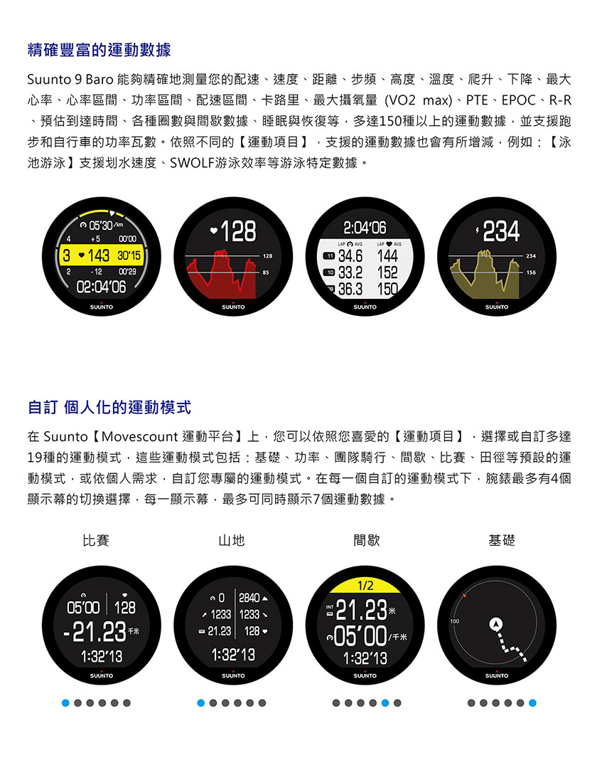 當您想要完成一個【運動鍛鍊】的目標,或從事一個戶外的探索與冒險活動時,為了確保您的運動腕錶,像您一樣,具備長時間運動的精神與毅力,長達120小時,持續不中斷的運動追蹤紀錄與電池續航力。SUUNTO 9 BARO-為毅力而生-就像您一樣。SUUNTO 9 BARO 是一款多項目運動的全方位GPS運動腕錶,專為要求最嚴苛的運動員所設計製造。配置【智能電池續航力】管理系統,提供智能警示功能,確保電池續航力,滿足您所有運動鍛鍊及戶外冒險的需求。SUUNTO 9-堅固強勁,是您長時間的艱苦訓練、賽事與極限冒險的最佳夥伴。