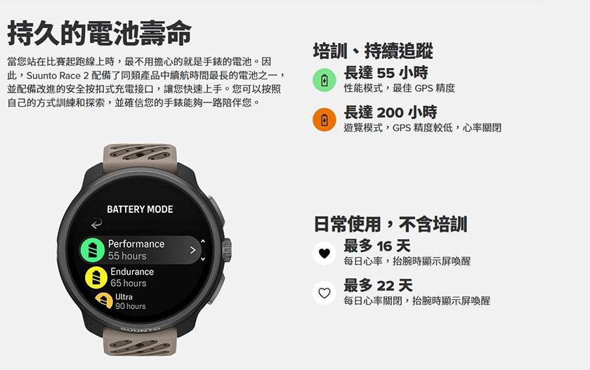 續電力提升,高精度性能模式下,使用時間由前代40小時延長至55小時,關閉心律的省電模式更由120小時提升至200小時,訓練時更放心。