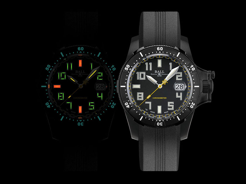 Engineer Hydrocarbon Black的設計刻意避免浮誇細節,只配置令人震撼的黑色錶盤及具有相同色調的的錶殼、計時旋轉外圈和錶帶。錶盤讓人一目了然,皆因顯示小時的數字刻度鑲嵌了3H自體發光微型氣燈。此設計由BALL Watch持有專利註冊,以瑞士頂尖發光科技讓佩帶者能不分晝夜地清晣讀時。錶盤上其他指標及指針均裝有3H自體發光微型氣燈,提供比傳統夜光塗料高達100倍的光亮度,而且不需倚賴任何外界光線或能源。錶盤上的綠色氣燈跟指針上的黃色氣燈構成一組獨特的夜光色,進一步提升了時間易讀性。凸緣上顯示分鐘的刻度及秒針所用的黃色氣燈跟整體的黑色洽到好處的互相映襯。